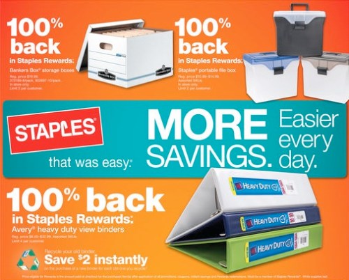 From Today until January 12th, 2013 Staples is offer 100% back on Avery heavy-duty binders, Staples portable file boxes & Bankers Box storage boxes. Everyone should take full advantage of this great offer. Storage boxes will come in handy for spring cleaning as well as good for storage in general. Binders, boxes and file boxes can be bought now and saved for school years to come. Staples filing boxes can help you get organized too! This is a new year so quit digging through piles of paperwork only to find that one you need. Let Staples PAY YOU to get organized! Save money and time by taking advantage of freebies like this and stock up for years to come! To see the full ad, click here.