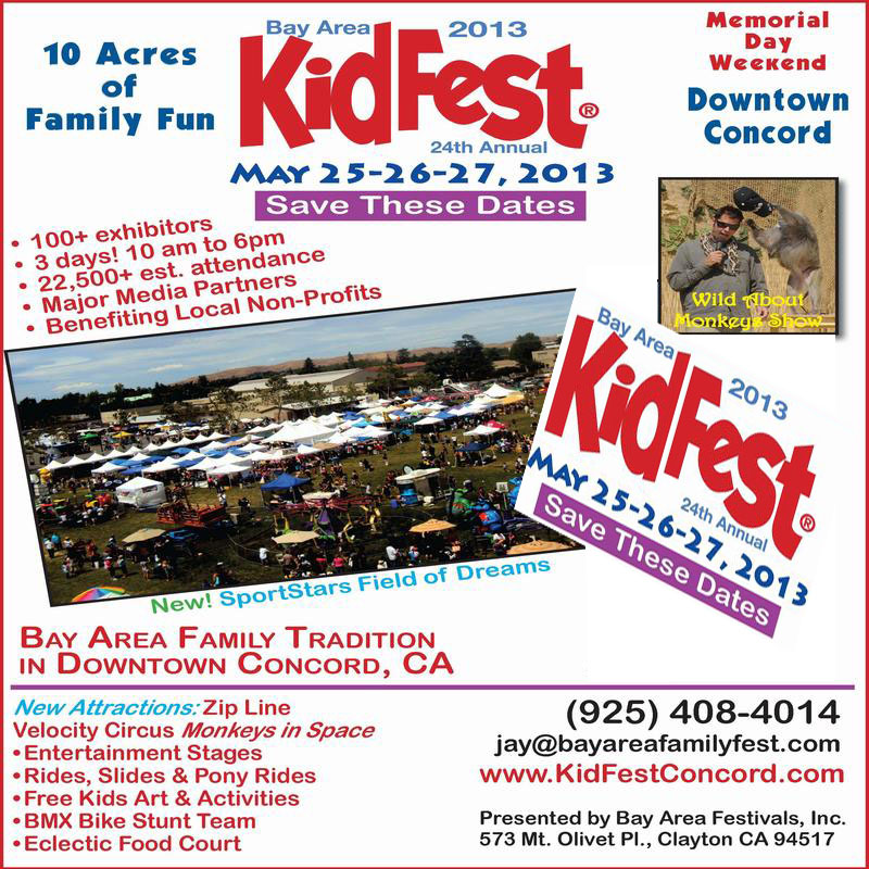 The 24th annual Bay Area KidFest is one of the Bay Areas longest-running family events on the 3-day Memorial Day Weekend. The venue will be Mt. Diablo High School’s spacious 10 acres in Downtown Concord will feature multiple entertainment stages including music, dance, ethnic performers, martial arts, gymnastics, animal shows, circus, magic, clowns and much more. Free kids arts & crafts activities, face painting, carnival games, balloon hats, inflatable and all-new Sports Field of Dreams. Rides include Zipline, ferris wheel, giant slide, pony rides, EuroBungy trampoline, climbing wall, petting zoo, Zippy Pets cars, Bobble Lagoon and more. Visit the eclectic Food Court and over 125 arts & crafts and exhibitor booths. Admission $5 with donation of canned food to Food Bank. KidFest benefits local non-profits in education, health and sports. The KidFest will be held from May 25-27, 2013 from 10:00 am – 6:00 pm. Admission is $5 per person with canned food donation babies under 24 months, seniors 65+ FREE. Parking on site $5. For more information visit, http://kidfestconcord.com.