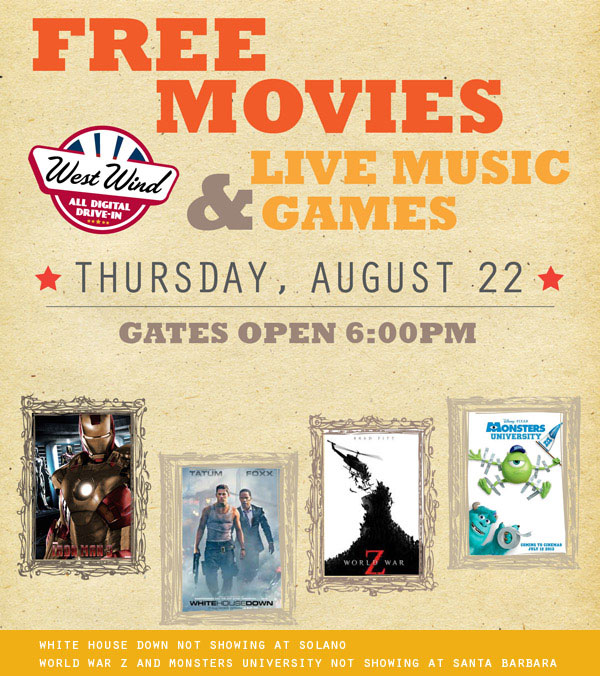 West Wind Theaters (off Solano Drive in Concord) is hosting their FREE ADMISSION night on Thursday, August 22, 2013. The featured movies are Iron Man 3, World War Z and Monsters Inc. Other activities include a live band, games and well stocked concession stands. Gates open at 6:00pm and the first movie starts at 8:00pm. Pack the picnic basket, grab an ice chest and enjoy a fun night out. Visit the West Wind Theaters for more information.