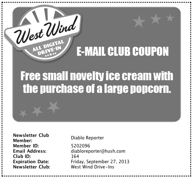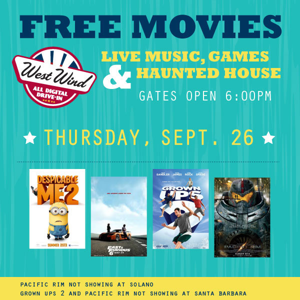 West Wind Theaters (off Solano Drive in Concord) is hosting their FREE ADMISSION night on Thursday, September 26, 2013. The featured movies are Despicable Me 2, Fast & Furious 6 and Grown Ups 2. Other activities include a live band, games and well stocked concession stands. Gates open at 6:00pm and the first movie starts at 8:00pm. Pack the picnic basket, grab an ice chest and enjoy a fun night out. Visit the West Wind Theaters for more information.