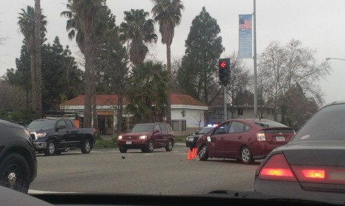 There’s a vehicle accident on Clayton Rd and Thornwood in Concord. There’s a red Prius blocking the intersection. Traffic is delayed both directions. Concord Police and a tow truck on scene.
