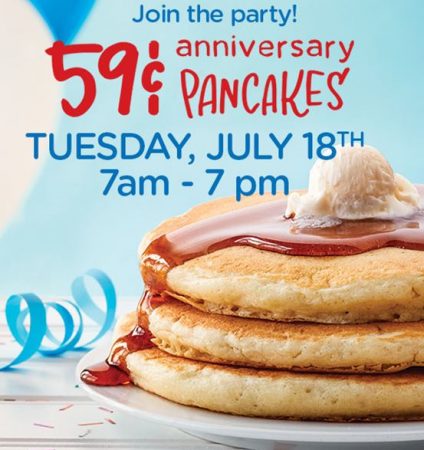 IHOP celebrates its 59th birthday with 59-cent pancakes, today, July 18, 2017. The pancake special is good from 7 AM to 7 PM with no coupon required. Each guest can enjoy one short stack of buttermilk pancakes for 59 cents.