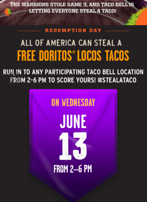 Do you like tacos? Do you like Doritos? Then do I have a deal for you. Taco Bell is giving away Doritos Locos tacos nationwide today. This is part of the fast-food chain’s NBA promotion, where if a basketball team during the current championship “steals” an away game, Taco Bell would give away free tacos. Well, that happened last night when the Golden State Warriors beat the Cleveland Cavaliers.